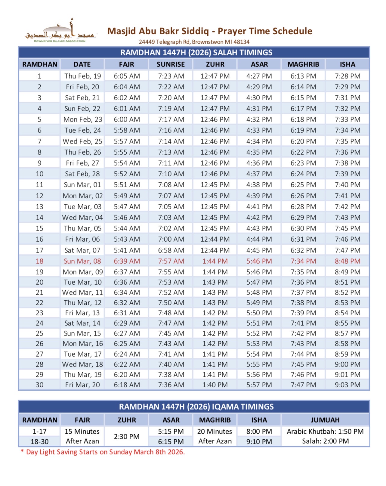 Masjid Abu Bakr Siddiq is a 501 (c) non-profit organization located in Brownstown, MI. Masjid A.B.S provides 5 daily prayers and weekly Jummah. In addition, Masjid A.B.S offers a Hifz + Academy program, Maktab class and weekly Dars-E-Quran.